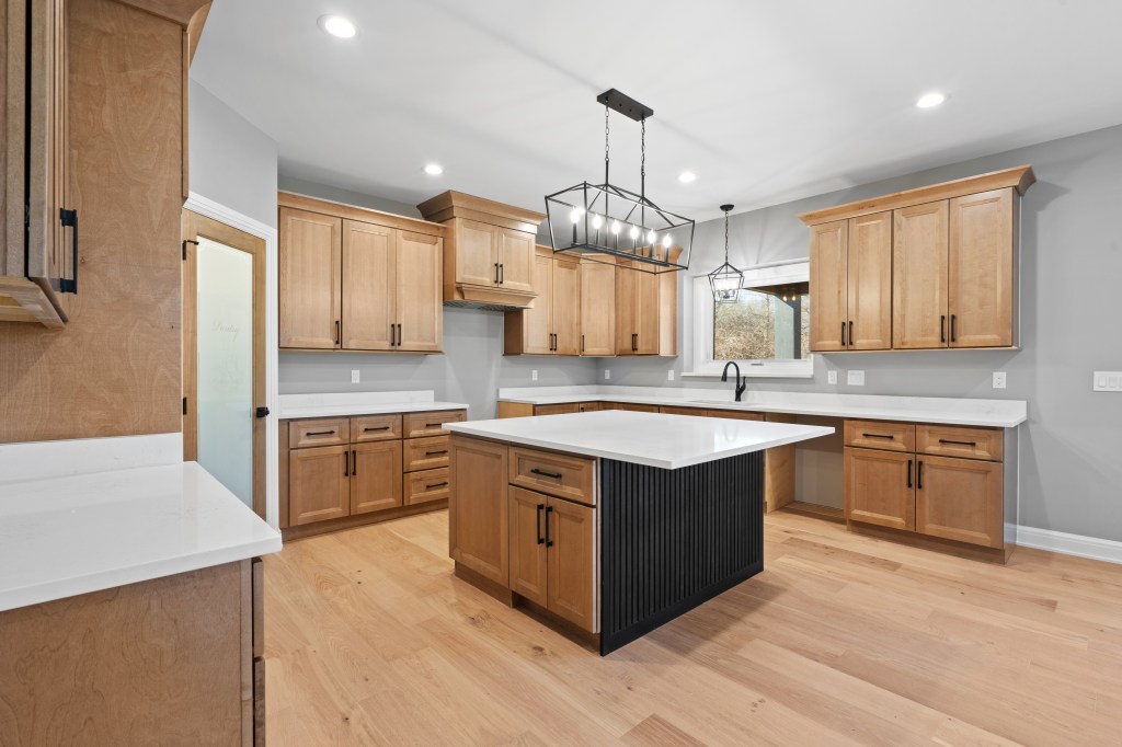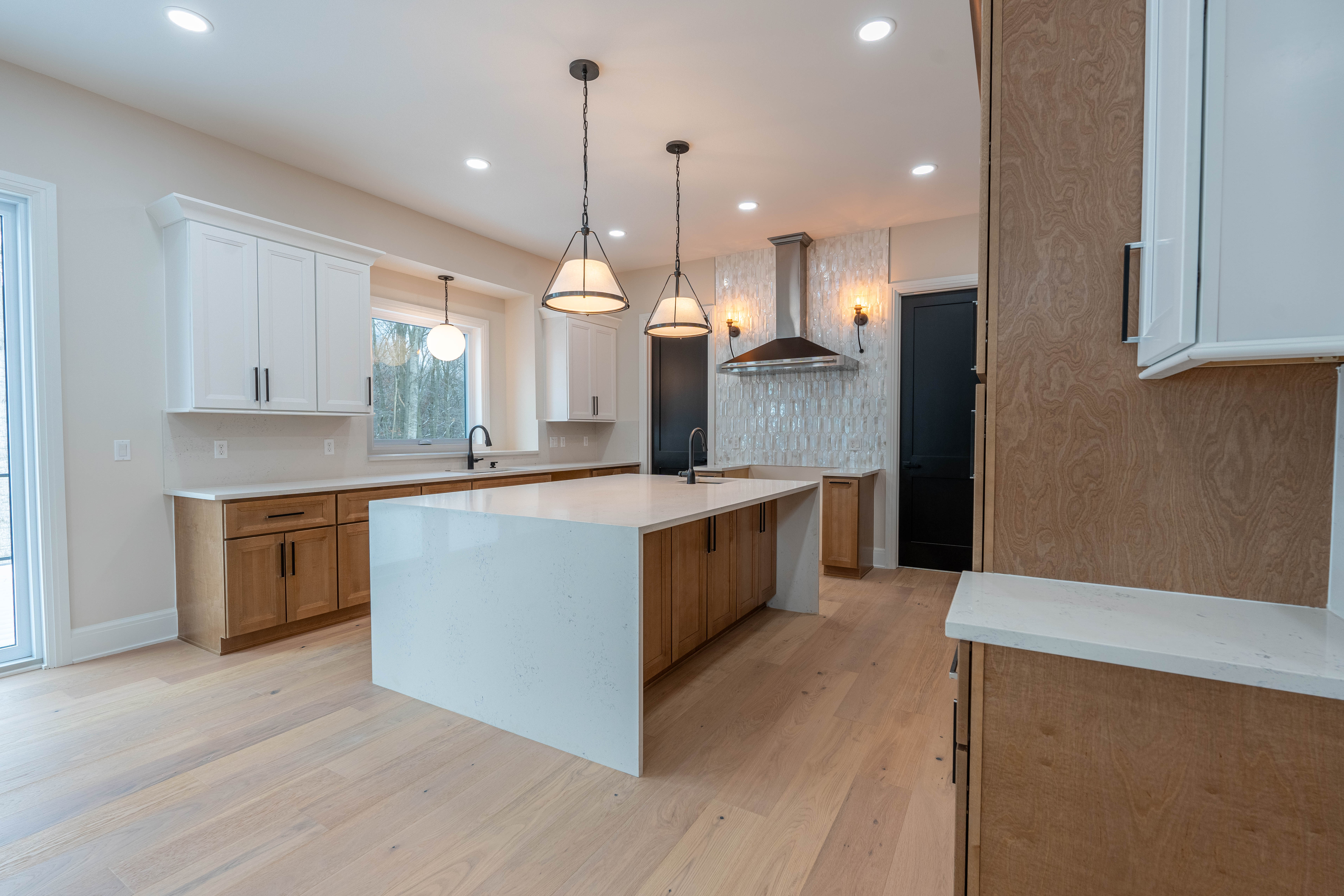 In many of our kitchens, we incorporate beautiful two-tone cabinetry, often blending classic white with a natural wood-tones for depth and contrast, Modern floating shelves are features throughout our designs, offering both practical storage and a clean, contemporary aesthetic. Oversized kitchen islands serve as the centerpiece of the home, offering generous seating and prep space ideal for everyday living or entertaining guests.